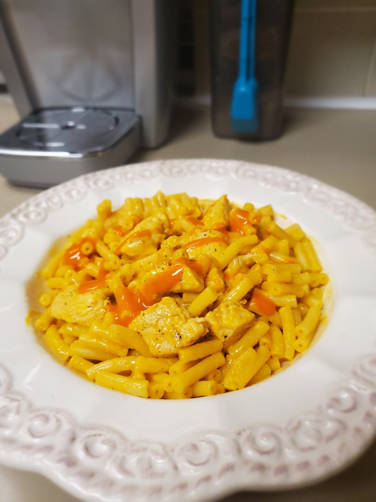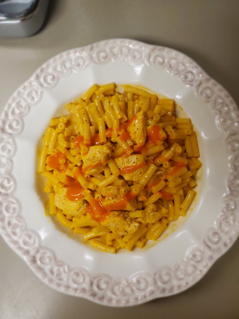 • Cut chicken breast into small pieces and cook fully in a pan with buffalo sauce. Then make the mac and cheese according to the box. When both are cooked, put into a bowl and top with as much buffalo sauce as you would like!